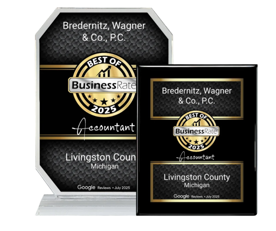 For 2025, Bredernitz, Wagner & Co., P.C. is proud to be recognized as the #1 accounting firm in Livingston County by BusinessRate in July 2025. This award highlights our decades-long commitment to client service, professional integrity, and local impact. Thank you to our clients for making this possible!